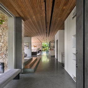 בבית יש שימוש רב בחומריות מגוונת – בטון, אבן טרוורטין מסורקת, אבן טבעית, תקרת עץ סרגלים ועוד - שעובדים ביחד בהרמוניה ומייצרים עושר של שכבות וחום מבלי לייצר עומס.