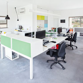 הקיר הבולט ביותר בחלל הוא קיר הנגרות של המטבחון הבנוי ממלבנים סמטרים בפלטת צבעים ייחודית. מלבד רהיט ייעודי של עמדות העבודה במרכז ה-Open Space, עומדת וטרינת זכוכית שיוצרת תחימה לחדר ישיבות ופינת עבודה נוספת ועליה כיתוב שנמצא בספר שירים בקיבוץ ומתאר את תחושת המרחב והנוף.